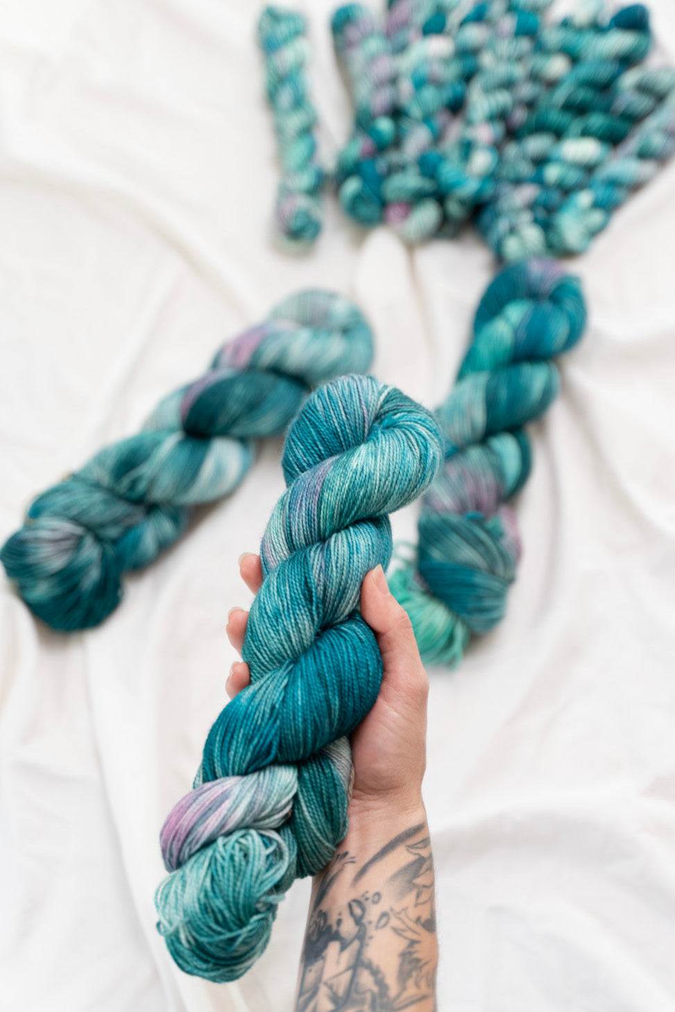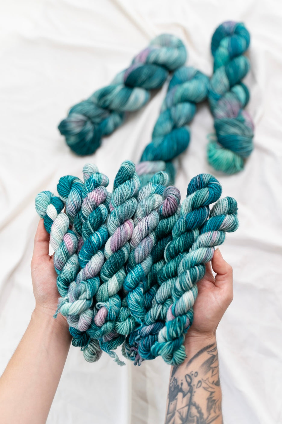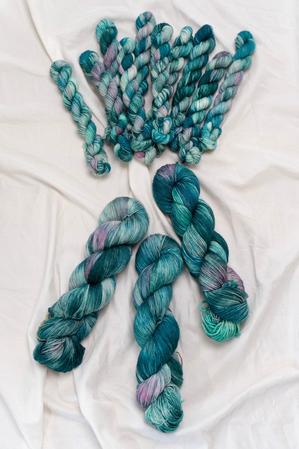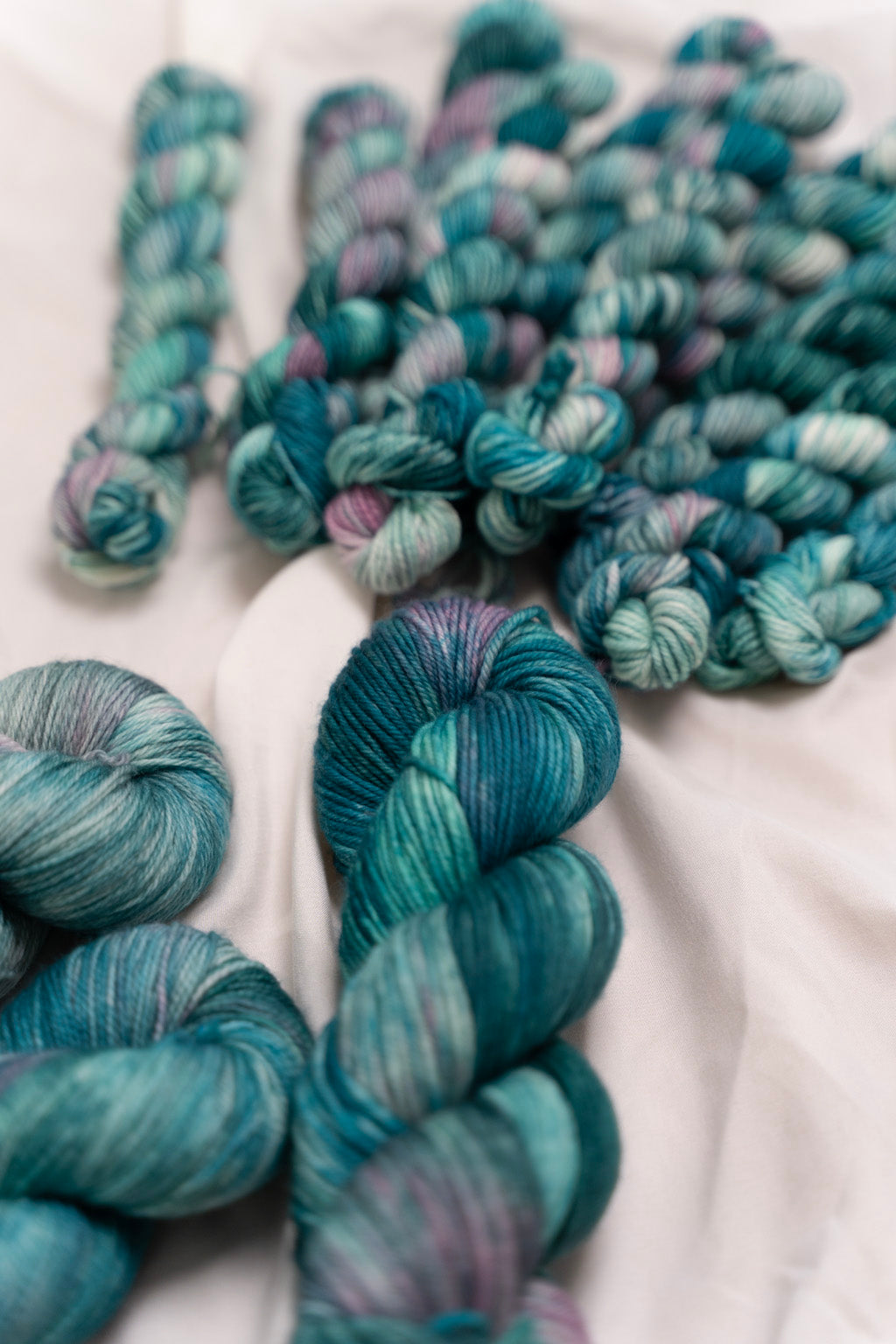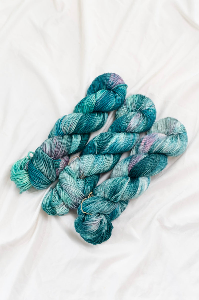 Colorways dyed on the Cotton & Silk bases will be more subdued, retaining less vibrancy than other bases with higher wool content. You can check out the Saturation page for side by side comparisons between bases!