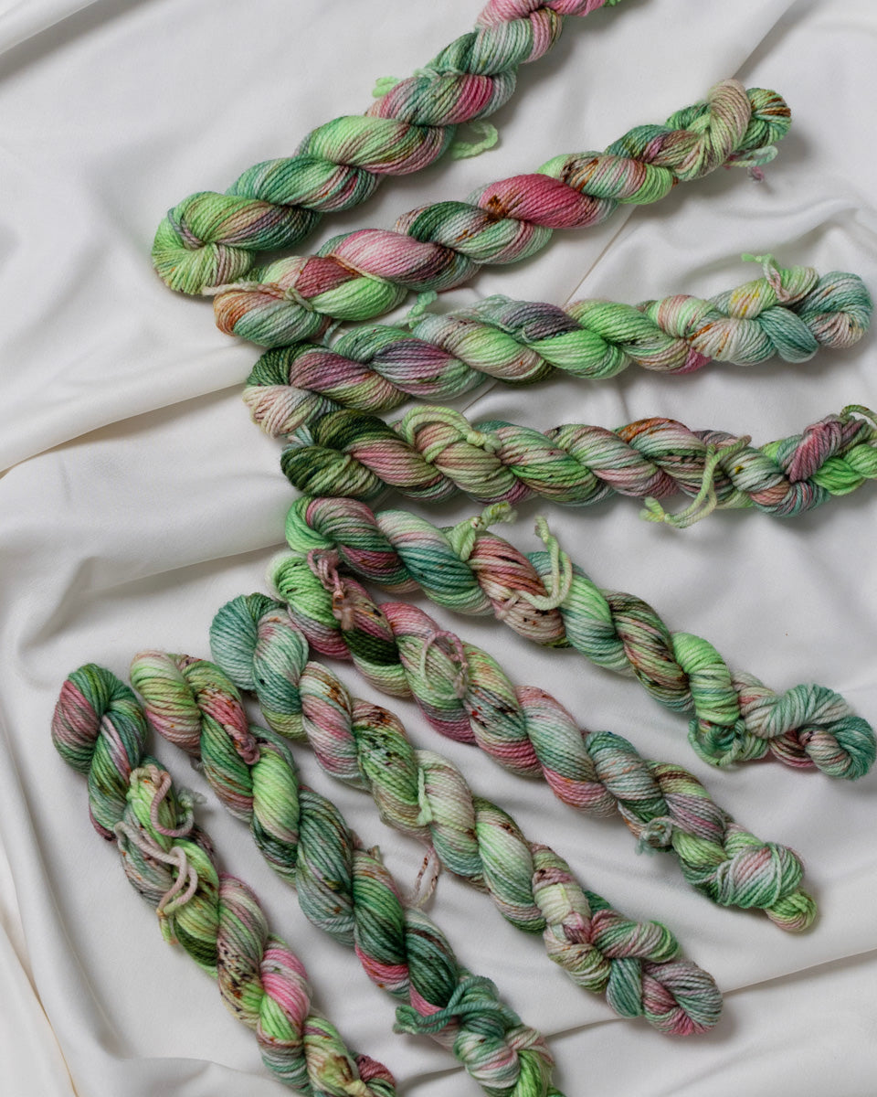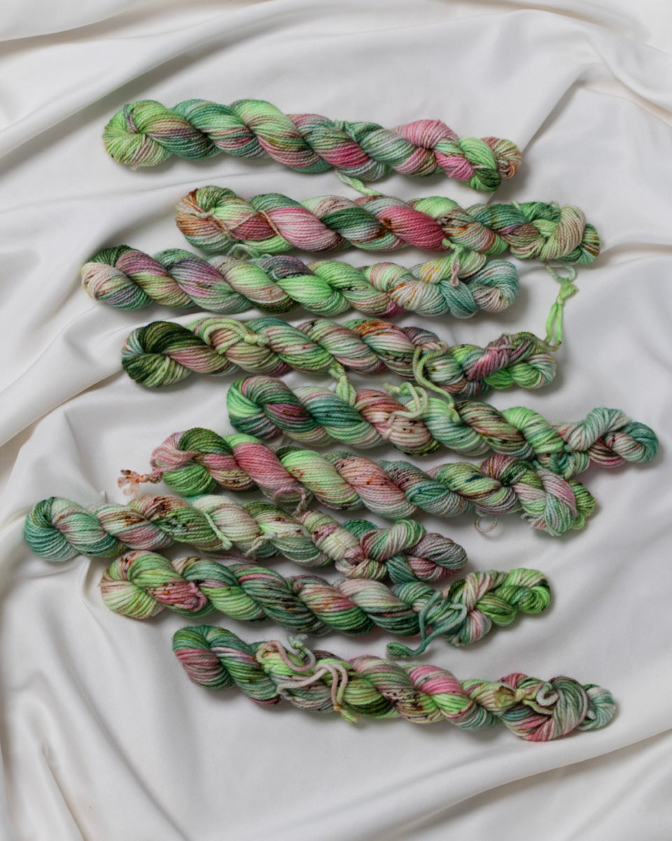 Colorways dyed on the Cotton & Silk bases will be more subdued, retaining less vibrancy than other bases with higher wool content. You can check out the Saturation page for side by side comparisons between bases!