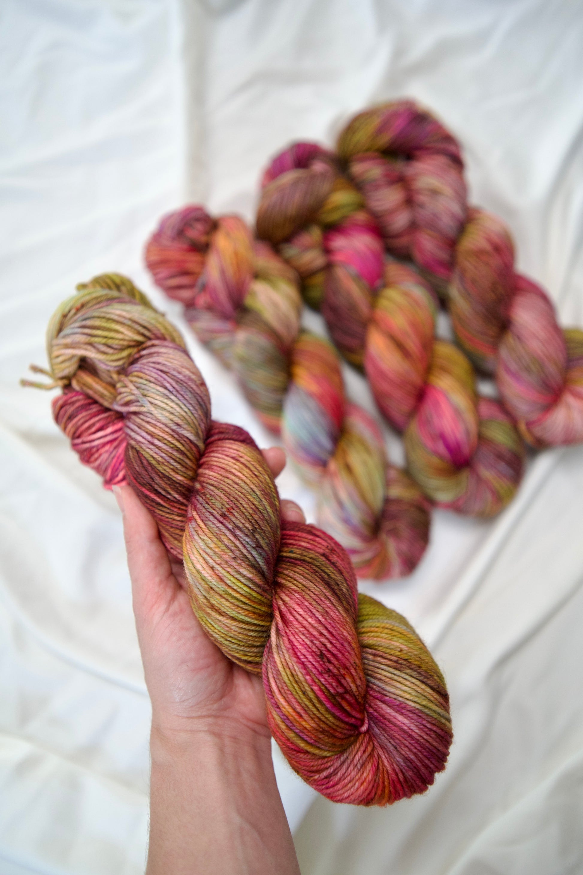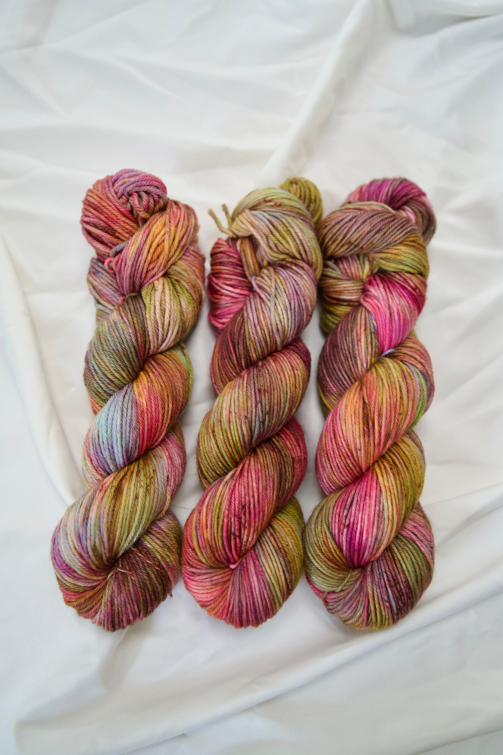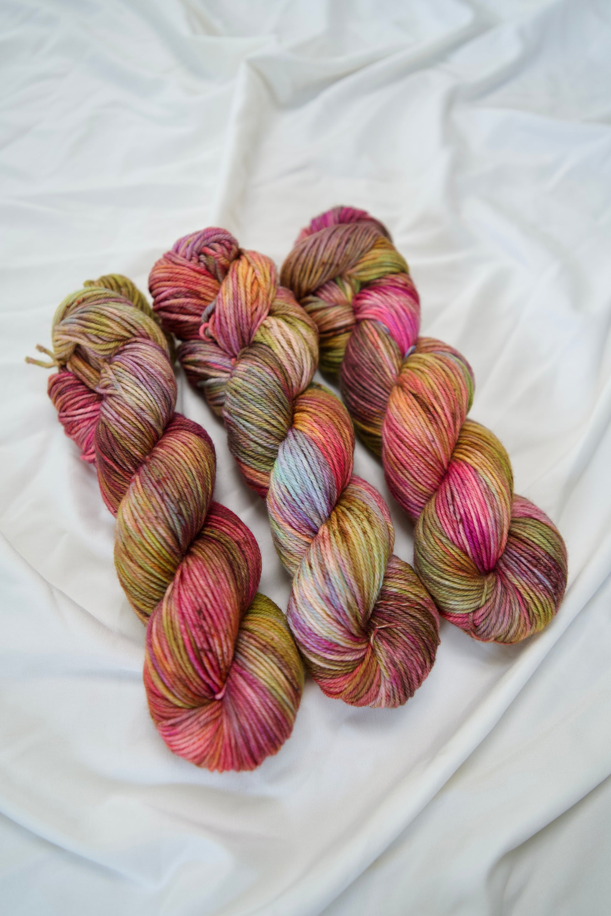 Colorways dyed on the Cotton & Silk bases will be more subdued, retaining less vibrancy than other bases with higher wool content. You can check out the Saturation page for side by side comparisons between bases!