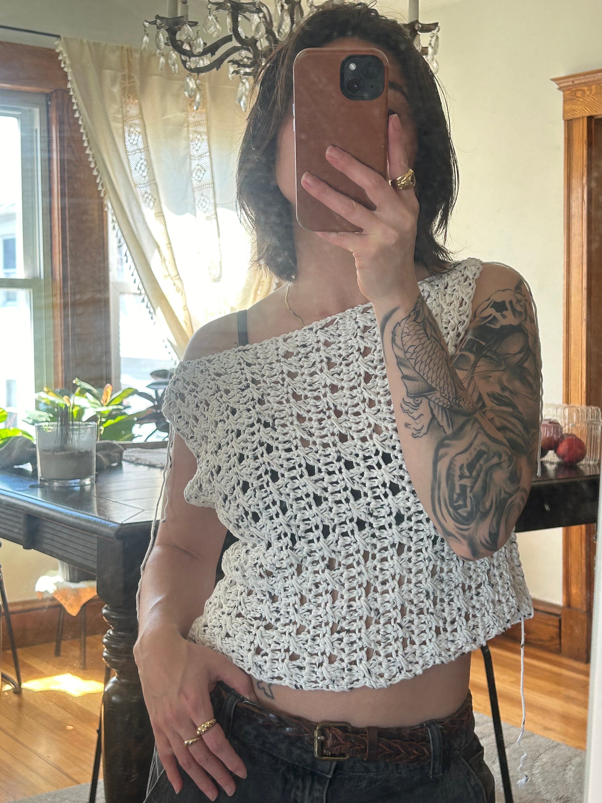 Construction - Garment is crocheted by creating two flat panels that are seamed along the upper shoulders and side seams of top.