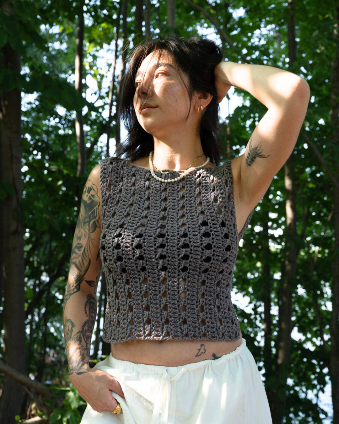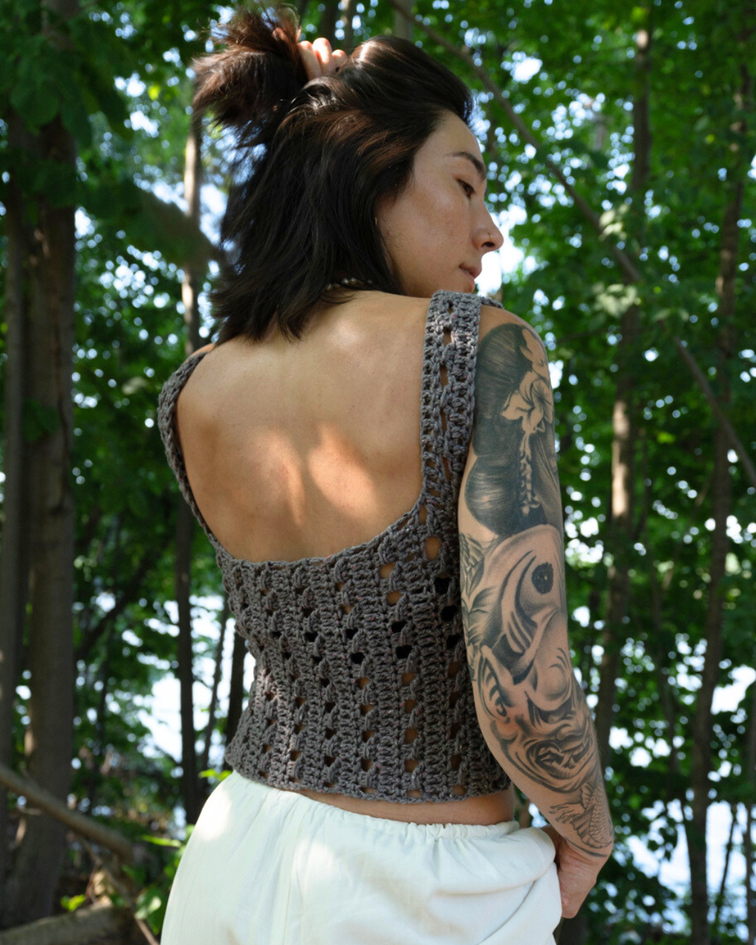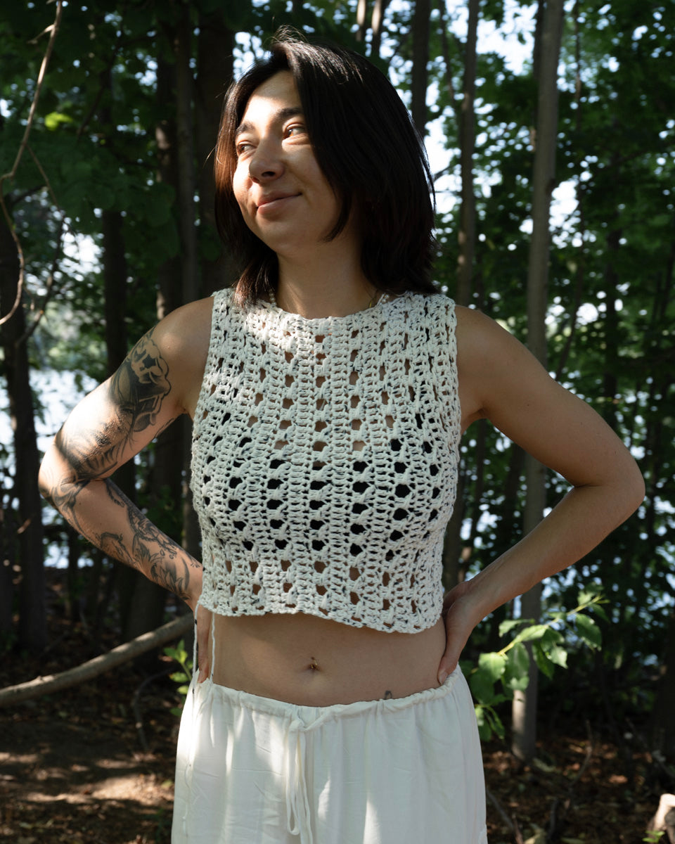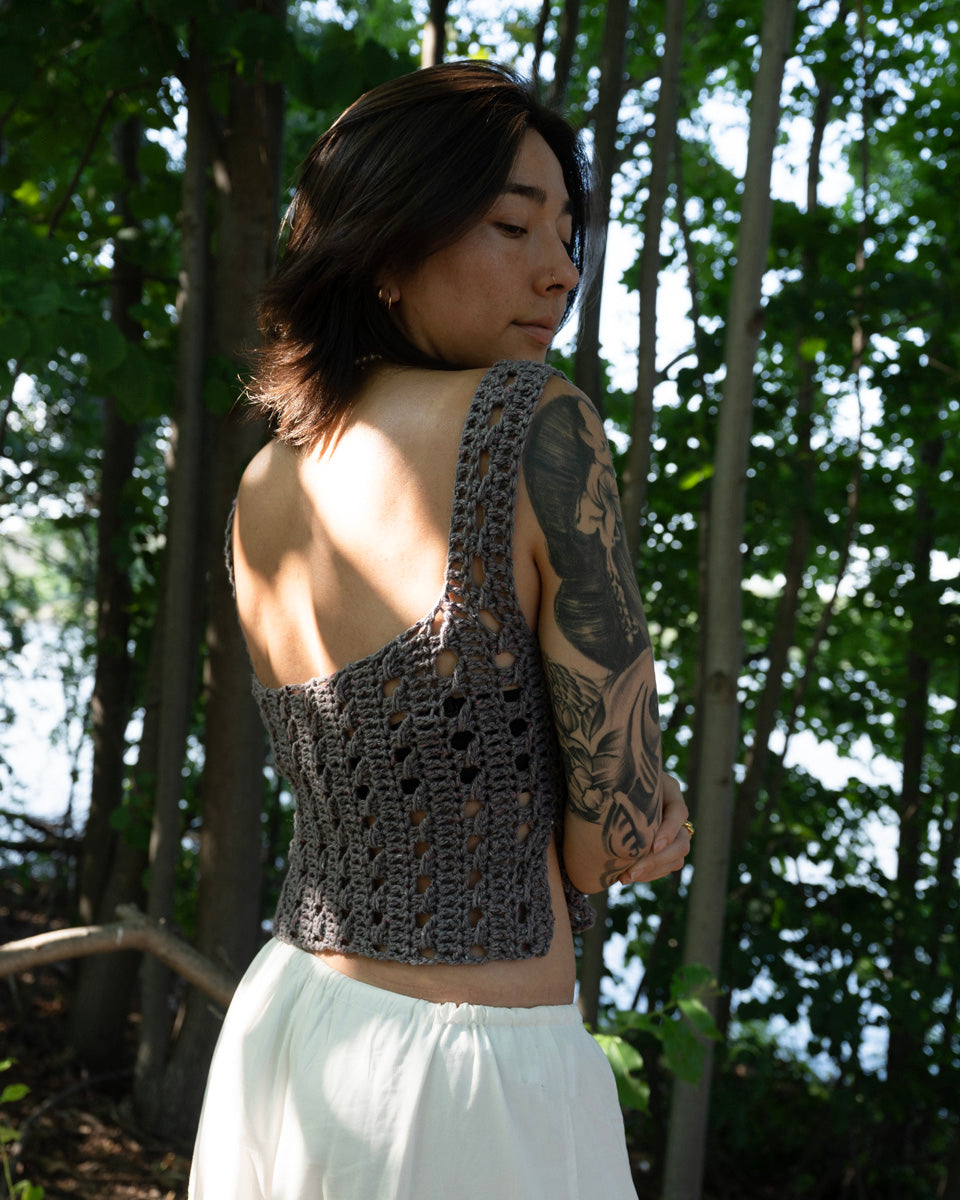 The Willow Top is an easy, super chic top perfectly paired for the summer season. This design is crocheted using two flat panels and a simple 2 row repeat. It also features a wrap-around technique creating a lacey eyelet stitch. The Willow Top can be made in a few different ways - high neck with a low back, reversible, or matching on both sides.